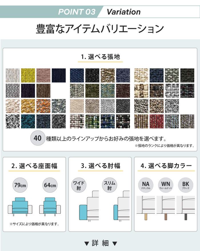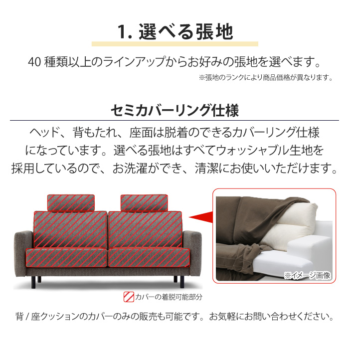 完全受注生産なので「1.張地の種類」「2.座面幅」「3.肘幅」「4.脚カラー」を選ぶことができます。
