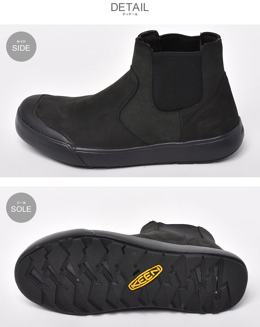スタイリッシュなチェルシーブーツデザインに、KEENならではの機能をブレンドした軽量スニーカーチェルシーブーツ。縫い目をシームテープで塞ぎ、水の侵入を防ぐシームシールド防水加工がドライで快適な履き心地を実現します。アッパーにはシリコン液を浸透させた特殊加工の防水プレミアムレザーとテキスタイルを採用しています。高い通気性を誇るメッシュライニングで蒸れを軽減します。サイドにはゴアパネルを採用し、脱ぎ履きを容易にします。