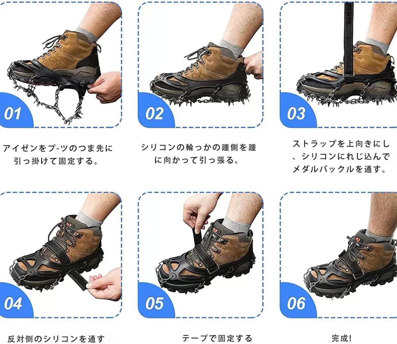 「着脱簡単・収納袋付き」着脱が容易な軽アイゼンです,上から靴下を履くような手順で簡単に装備が可能です,エラストマーバンドを靴に掛けるだけで装着でき。