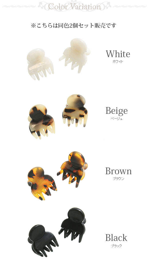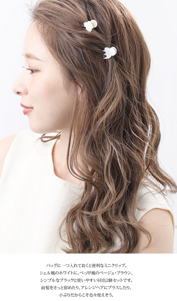 バッグに一つ入れておくと便利なミニクリップ。シェル風のホワイトに、べっ甲風のベージュ・ブラウン、シンプルなブラックと使いやすい同色2個セットです。前髪をさっと留めたり、アレンジヘアにプラスしたり、小ぶりだからこそ色々使えそう。