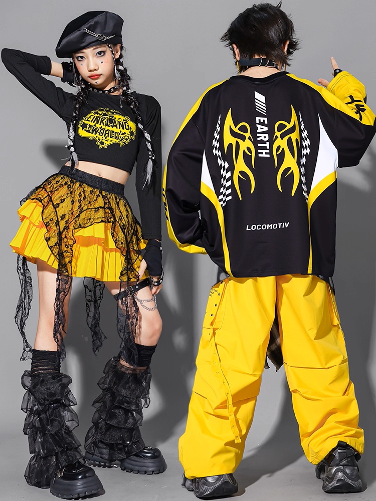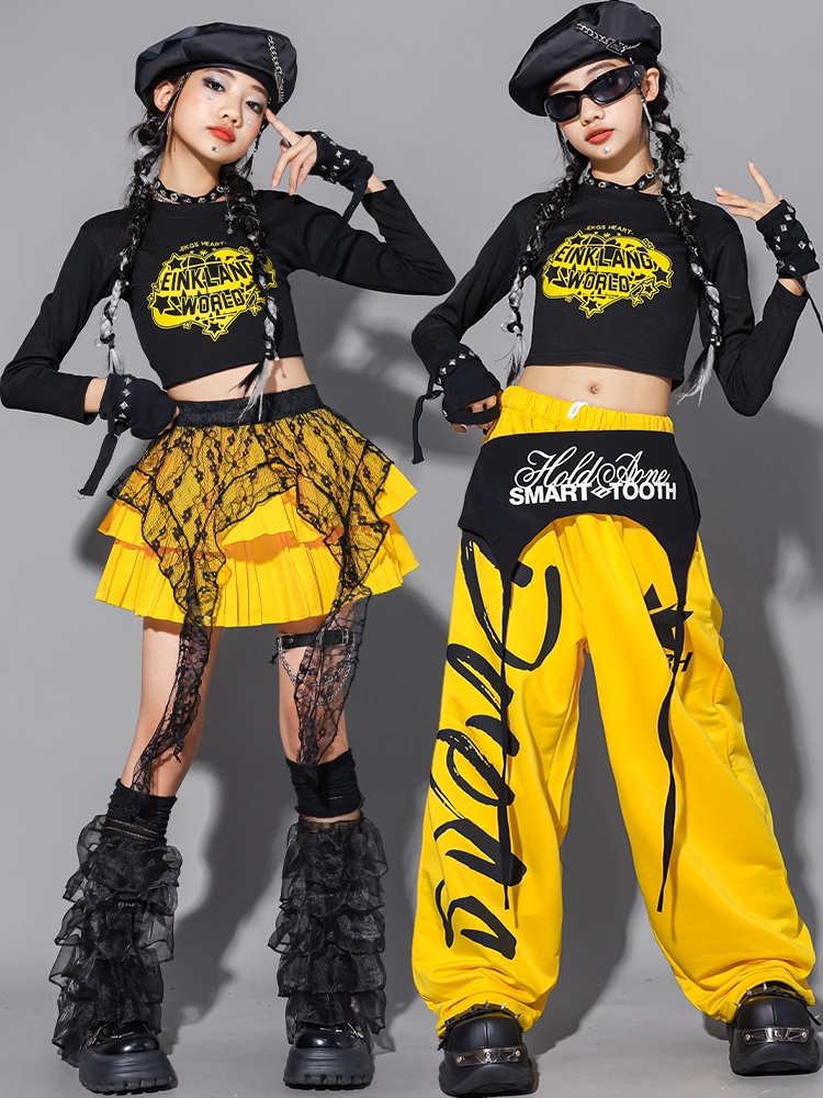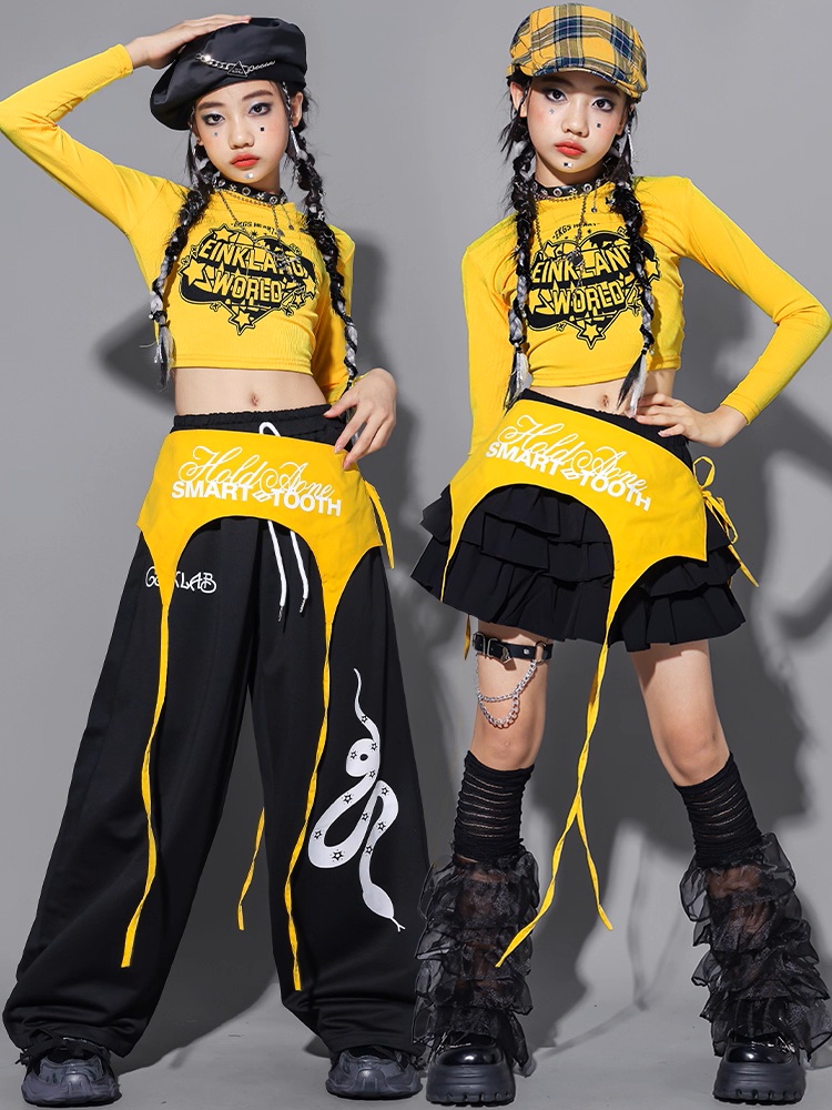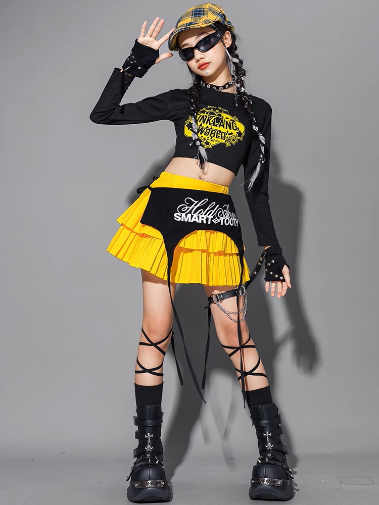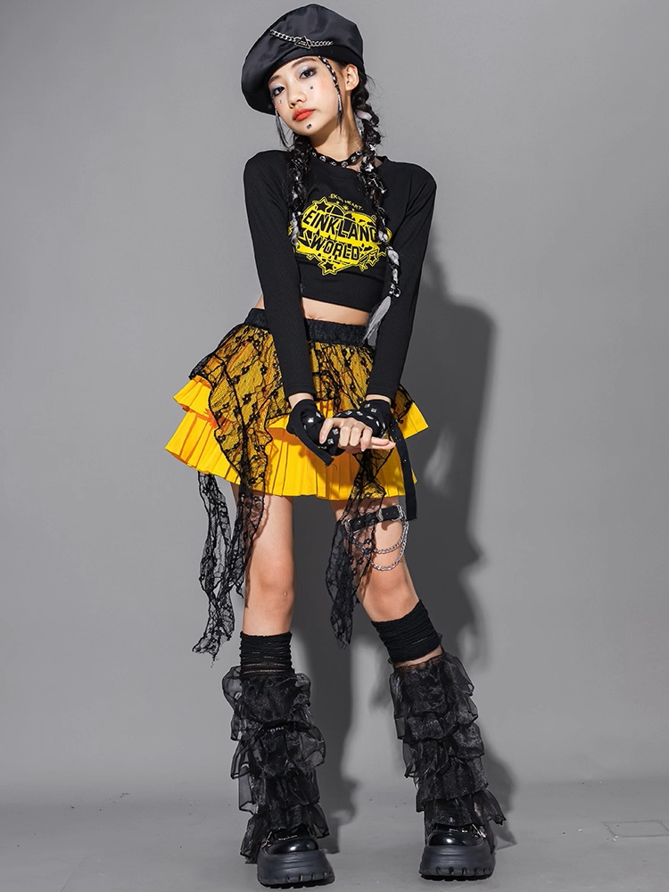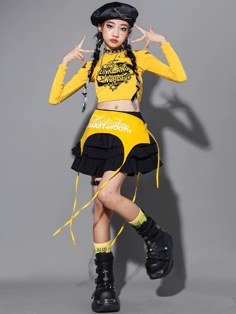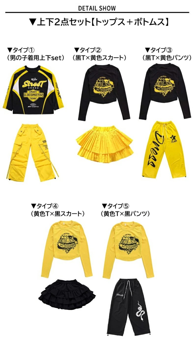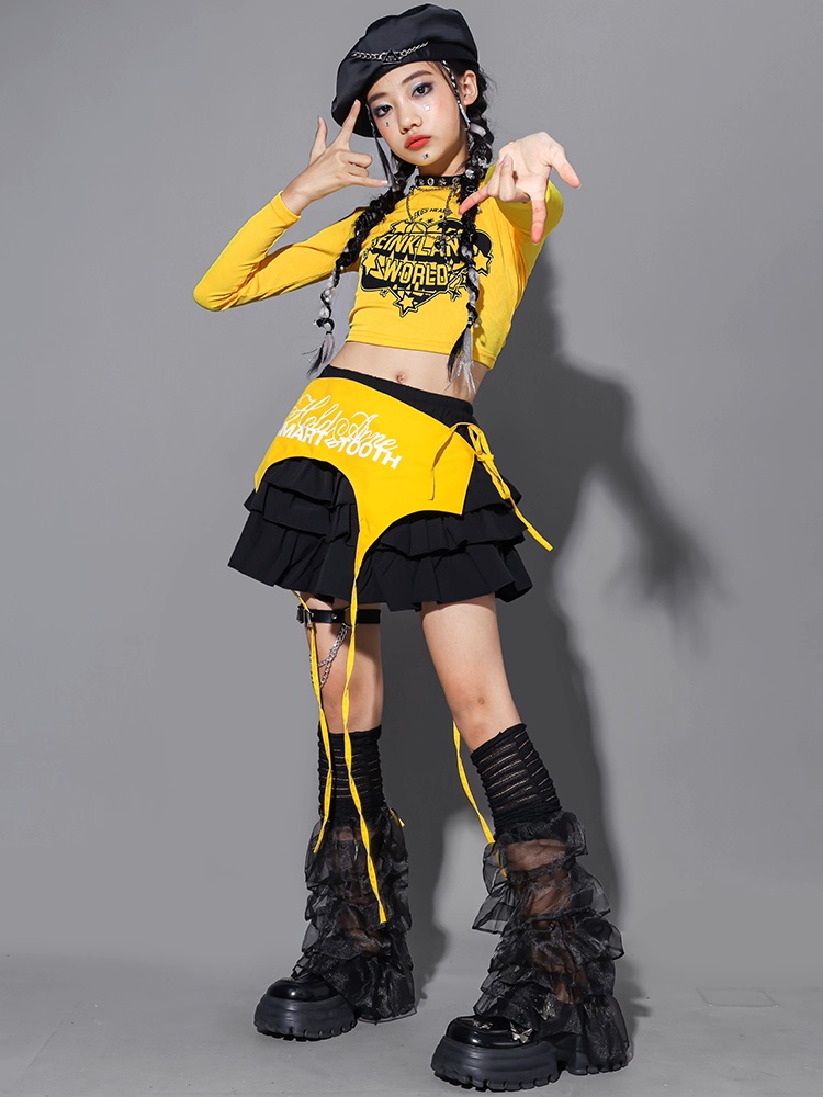 ダンス衣装 キッズ セットアップ 男の子 ガールズ ヒップホップ 衣装 ヘソ出しトップス フリルスカート 派手 子供ダンス服 K-POP 韓国 黒 黄色