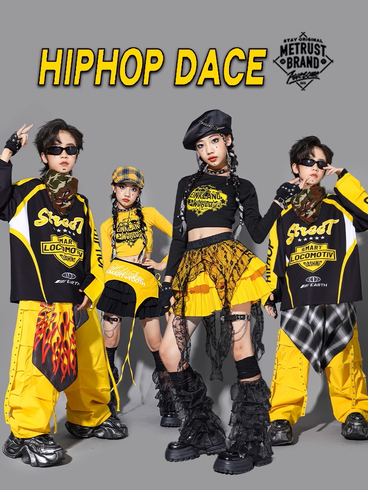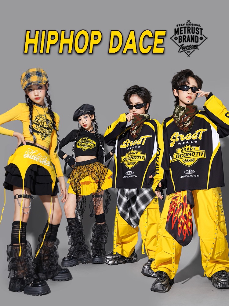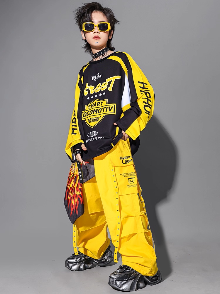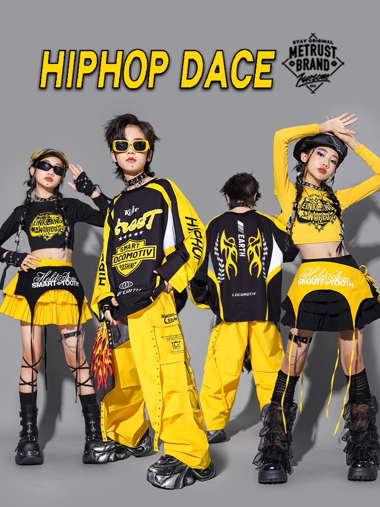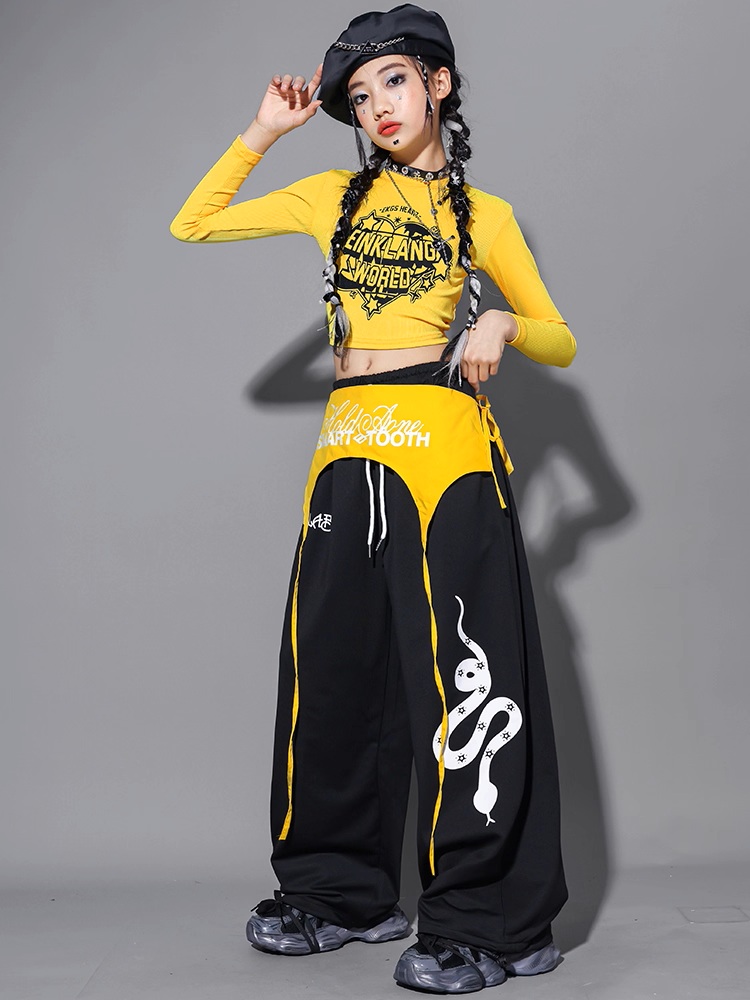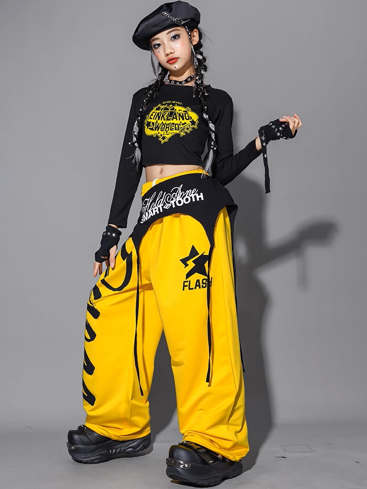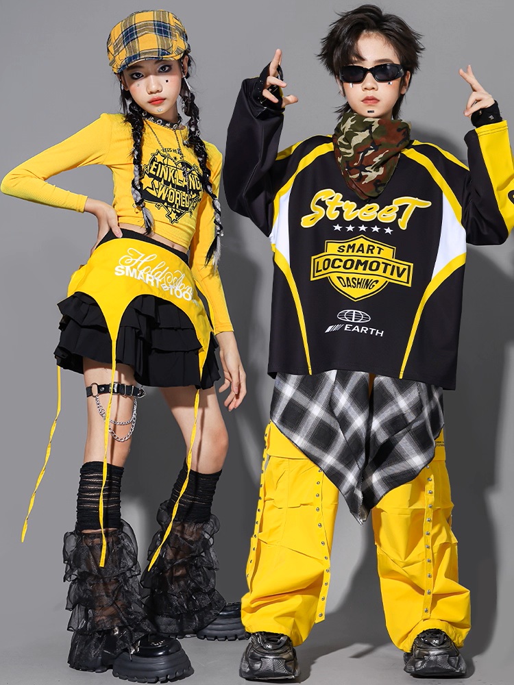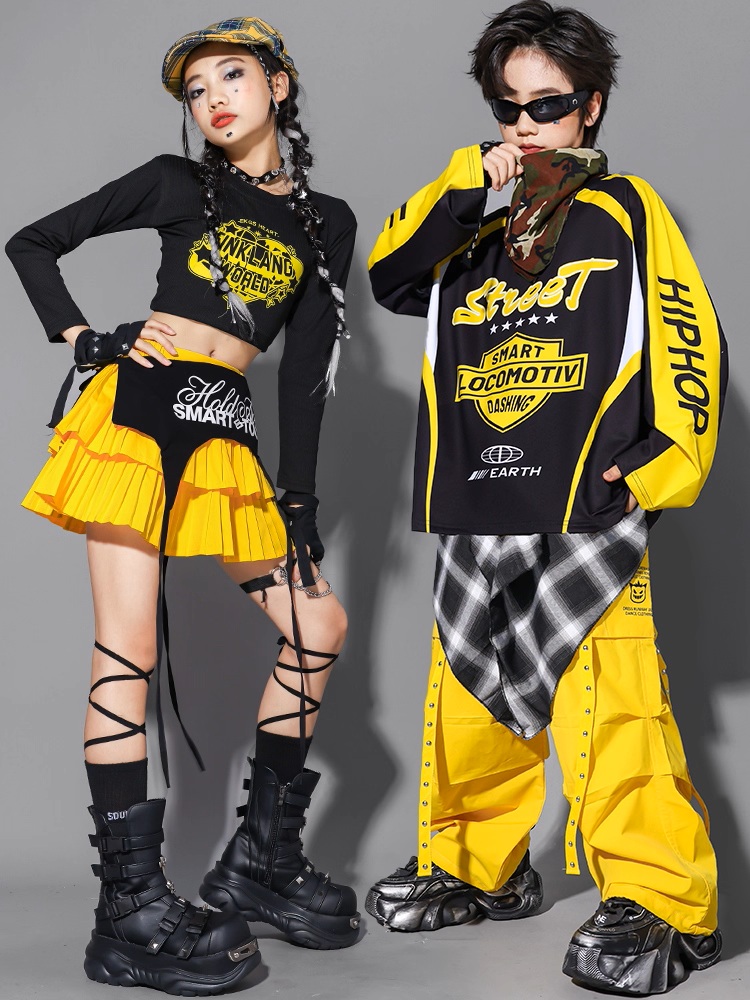 ダンス衣装 キッズ セットアップ 男の子 ガールズ ヒップホップ 衣装 ヘソ出しトップス フリルスカート 派手 子供ダンス服 K-POP 韓国 黒 黄色