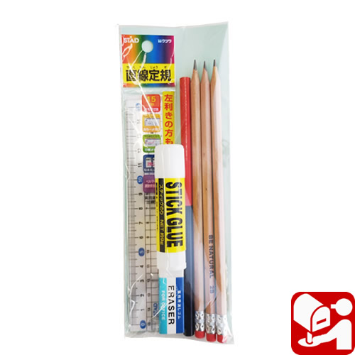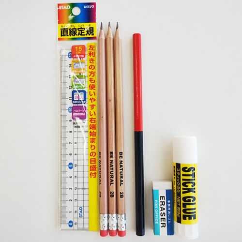【内容】えんぴつ×3、赤青えんぴつ・定規(15センチ)・消しゴム・スティックのり ×各1